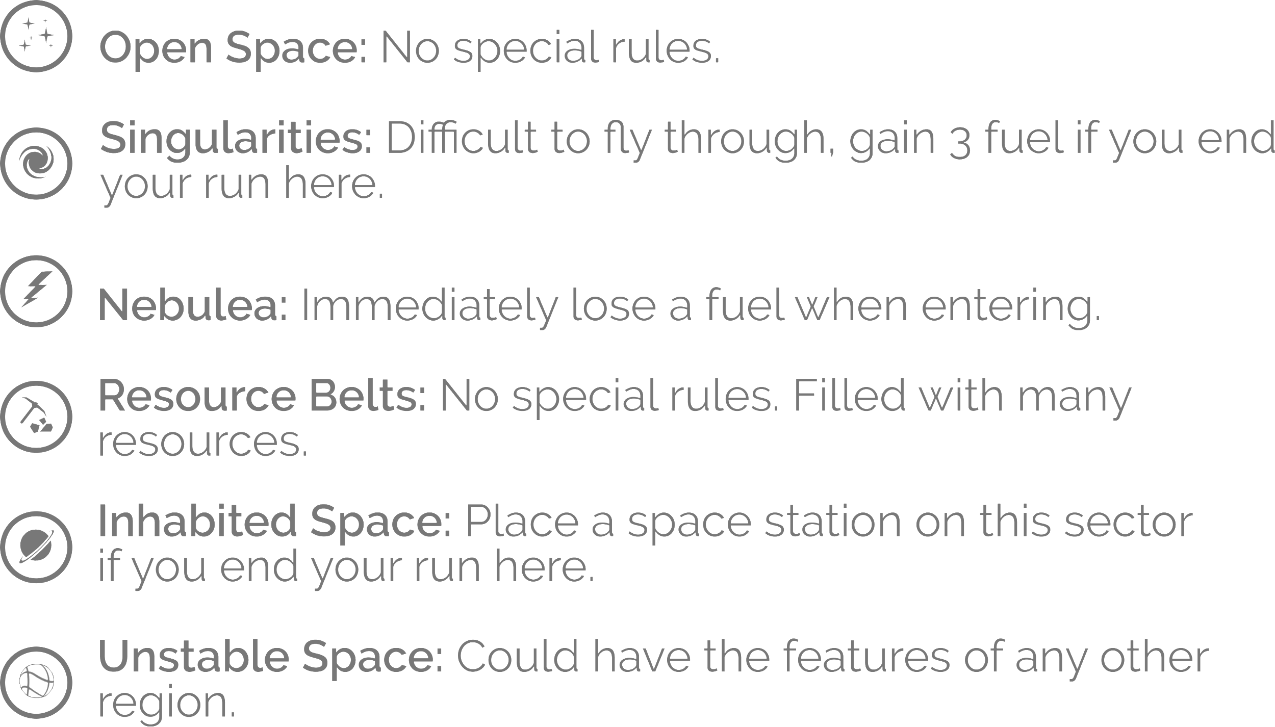 The sectors that you will encounter during your flight may apply bonuses or penalties as you move through them. When entering a sector, apply the following rules, according to type.
